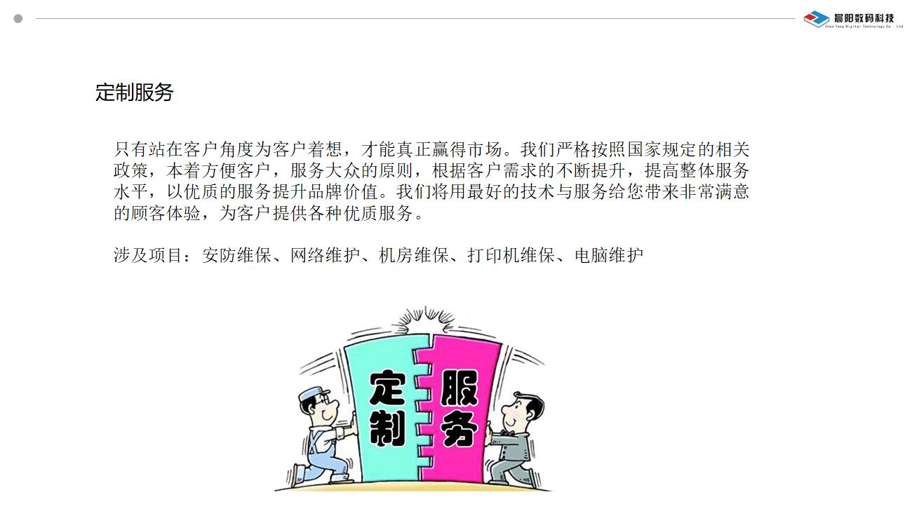 涉及項(xiàng)目:安防維保、網(wǎng)絡(luò)維護(hù)、機(jī)房維保、打印機(jī)維保、電腦維護(hù)。